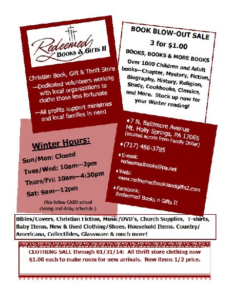DURING INCLEMENT WEATHER CONDITIONS OUR STORE WILL FOLLOW THE CARLISLE SCHOOL DISTRICT DELAY/ CANCELLATION SCHEDULE, i.e. if the school has a 2 hour delay the store will open at 11:00 am. and so on.